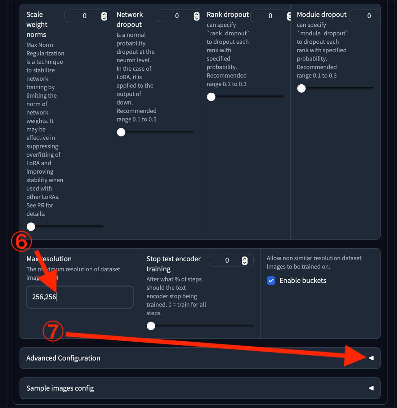 最初はまずLoRAを最後まで生成できるかどうか、自分のマシンで成功できる設定に辿り着く必要があります。そのためにはここの設定を下げておくと、1回の生成にかかる時間が5分程度に減少するので迅速にテストを終了できます。なので256,256に変更しています。なお、値が低すぎてもエラーが出て停止します。