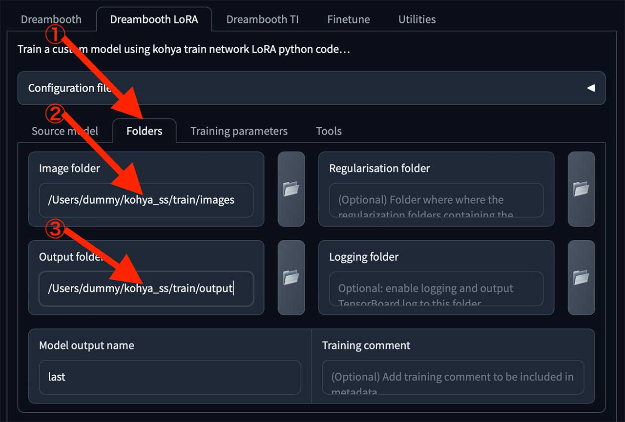 /Users/dummy/kohya_ss/train/output続いて③Output folder欄に上記をコピペしてください。