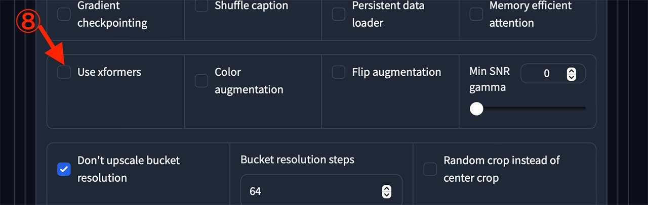 ⑧Use Xforemersのチェックボックスをオフにしてください。Xformersについて詳しくは前回記事の灰色の文を参照してください。