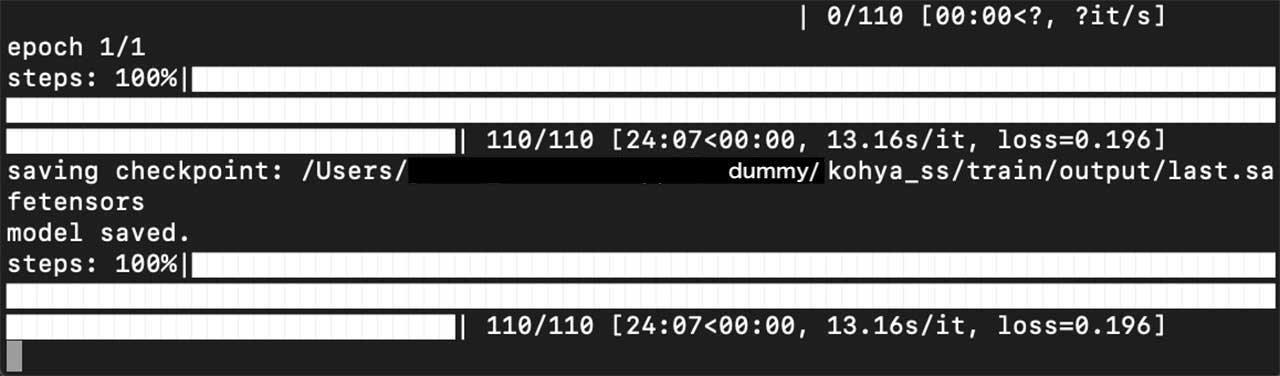 生成が終了すると上記のような画面になって止まります。次にFinderで/Users/dummy/kohya_ss/train/outputフォルダを開き、その中に生成されているlast.safetensorsというファイルをコピーし、前回記事のLoRA適用フォルダに保存してください。model保存用のフォルダでなくlora保存用のフォルダです。以降の使用法は前回記事と同じです。