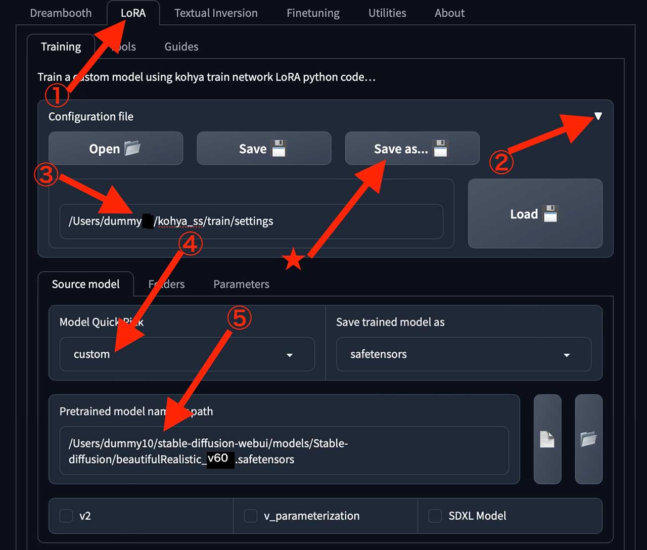 /Users/dummy/kohya_ss/train/settings次に②プルダウンメニューを開き、③欄に上記をコピペし、★マークで示したSave as…ボタンをクリックしてください。今後設定を変更したらこまめにこのボタンで保存しておいてください。