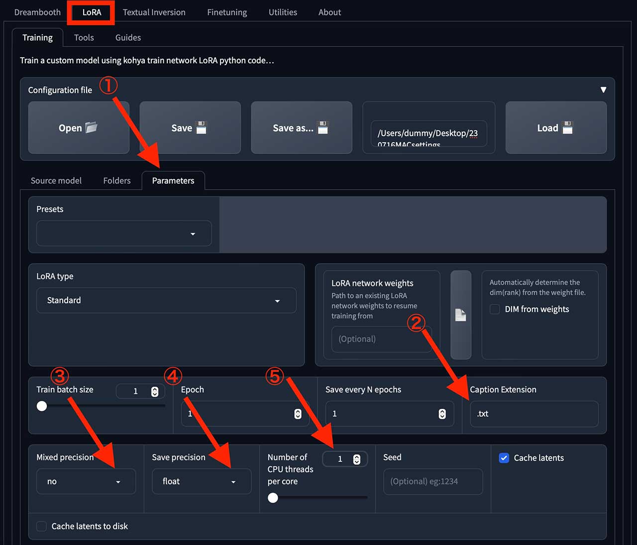また、③Mixed precisionを「no」④Save precisionを「float」、⑤Number of CPU threads per coreを「1」と設定してください。